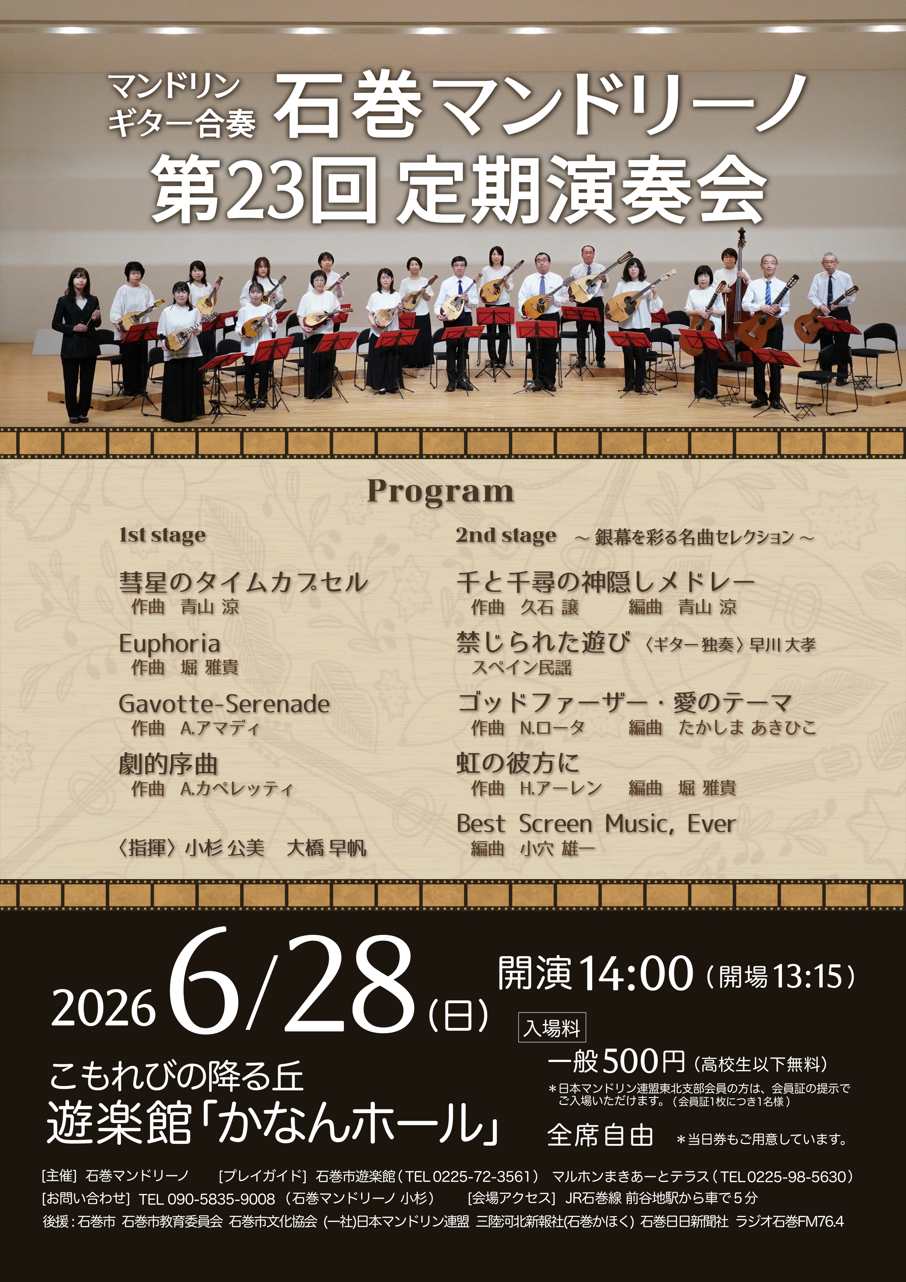 1st stageはマンドリンオリジナルを、2nd stageは『銀幕を彩る名曲セレクション』と題し、バリエーション豊かな映画音楽をマンドリン・ギター合奏でお届けします♪